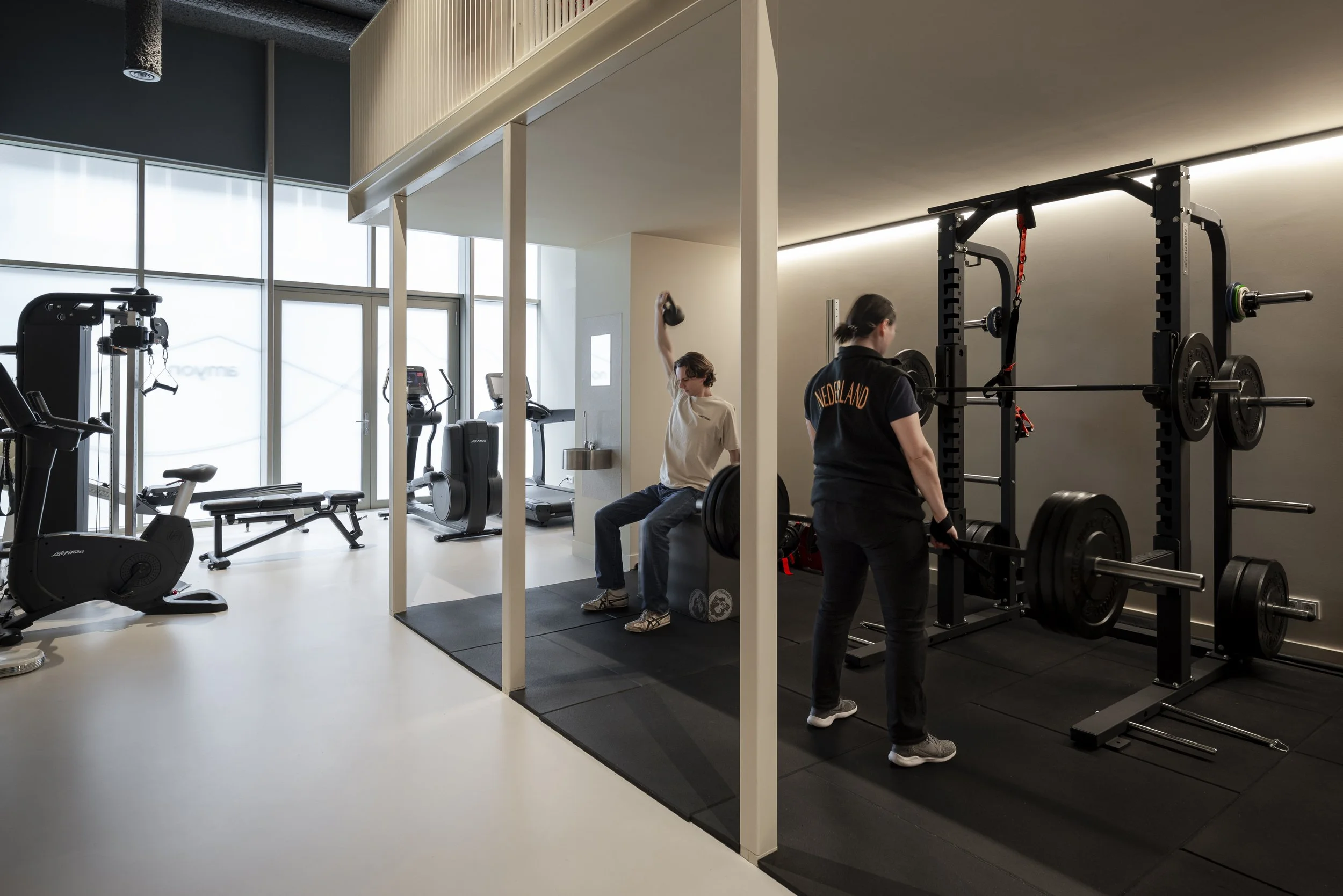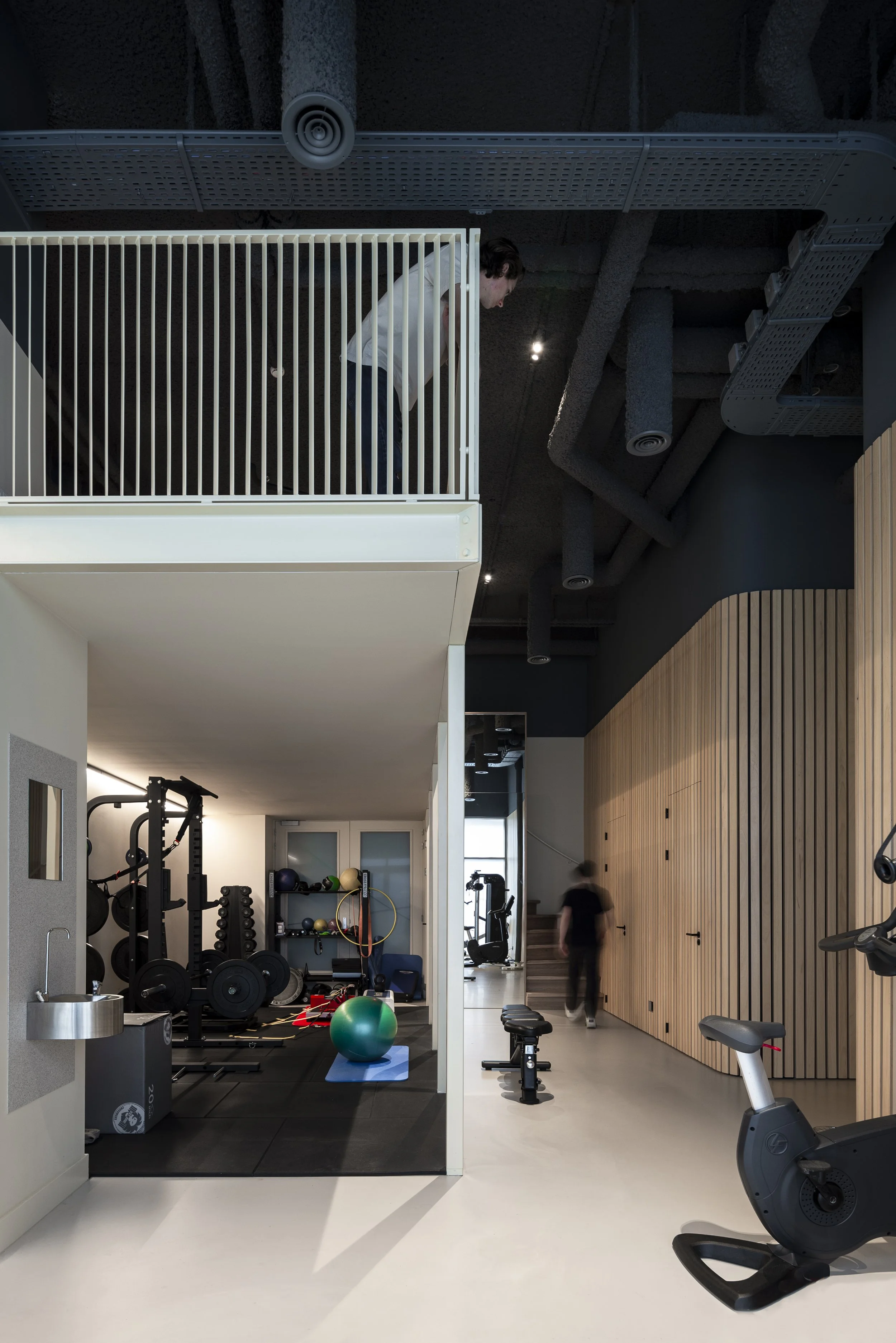 a mezzanine floor provides extra space, allowing for a wide variety of practice exercises