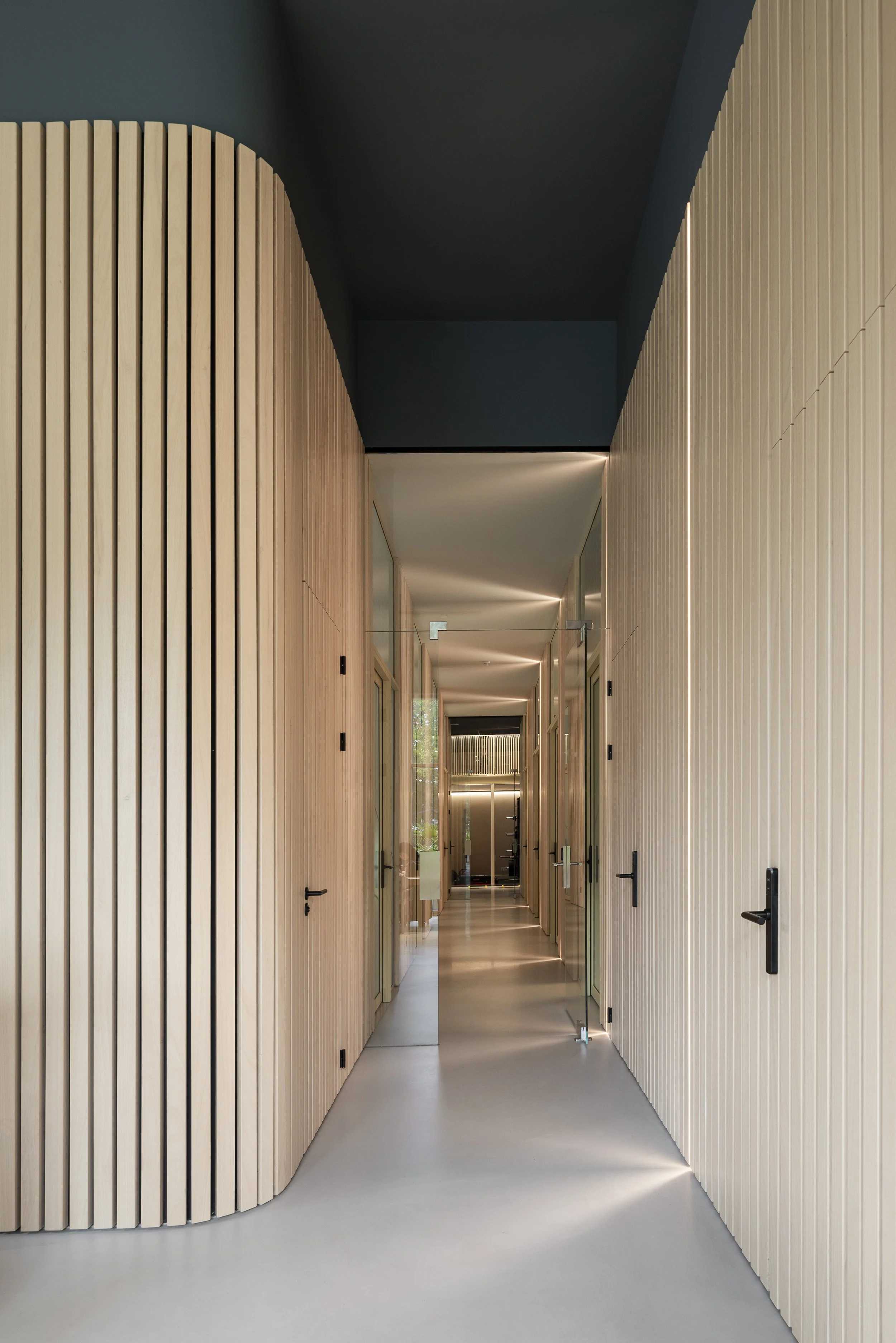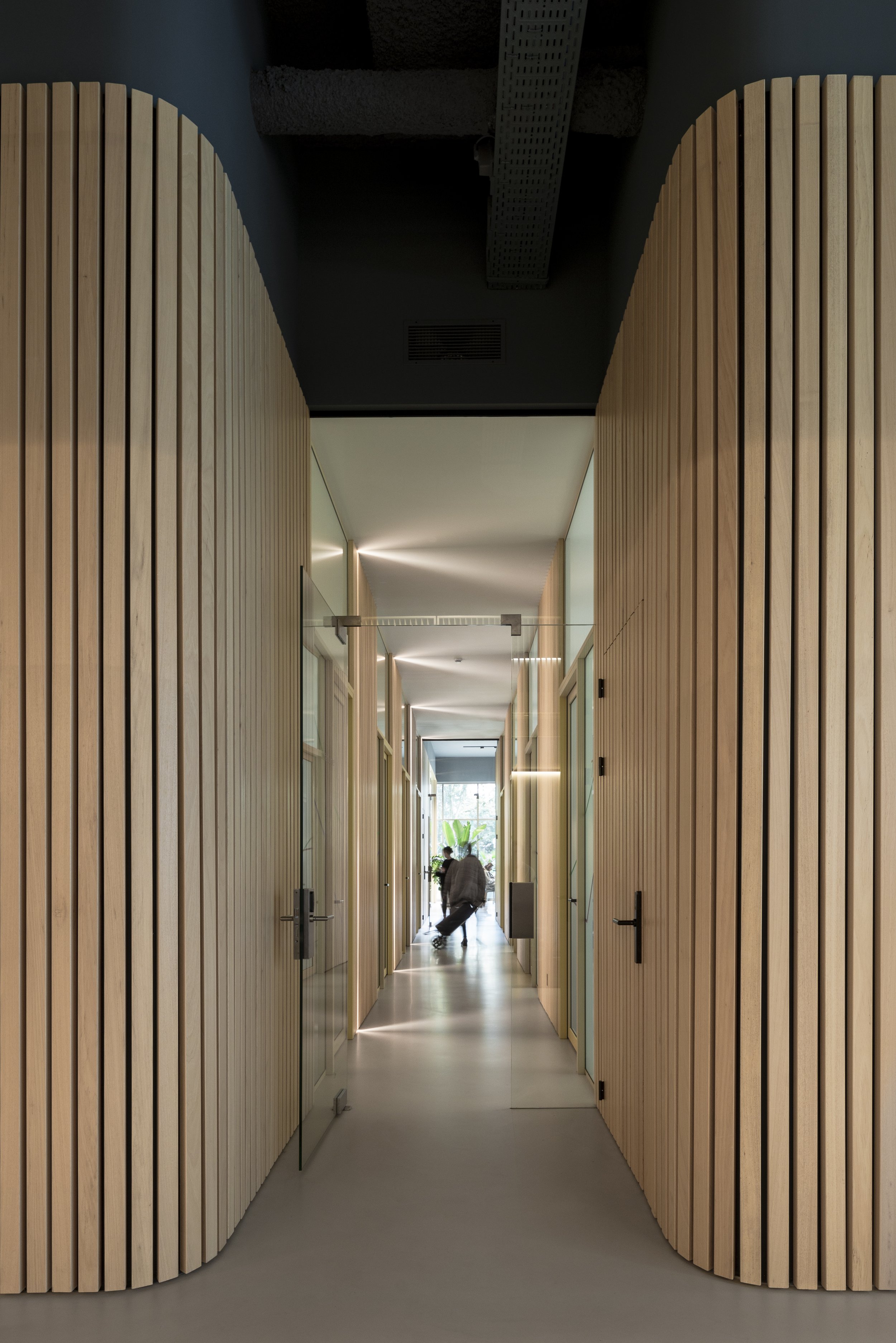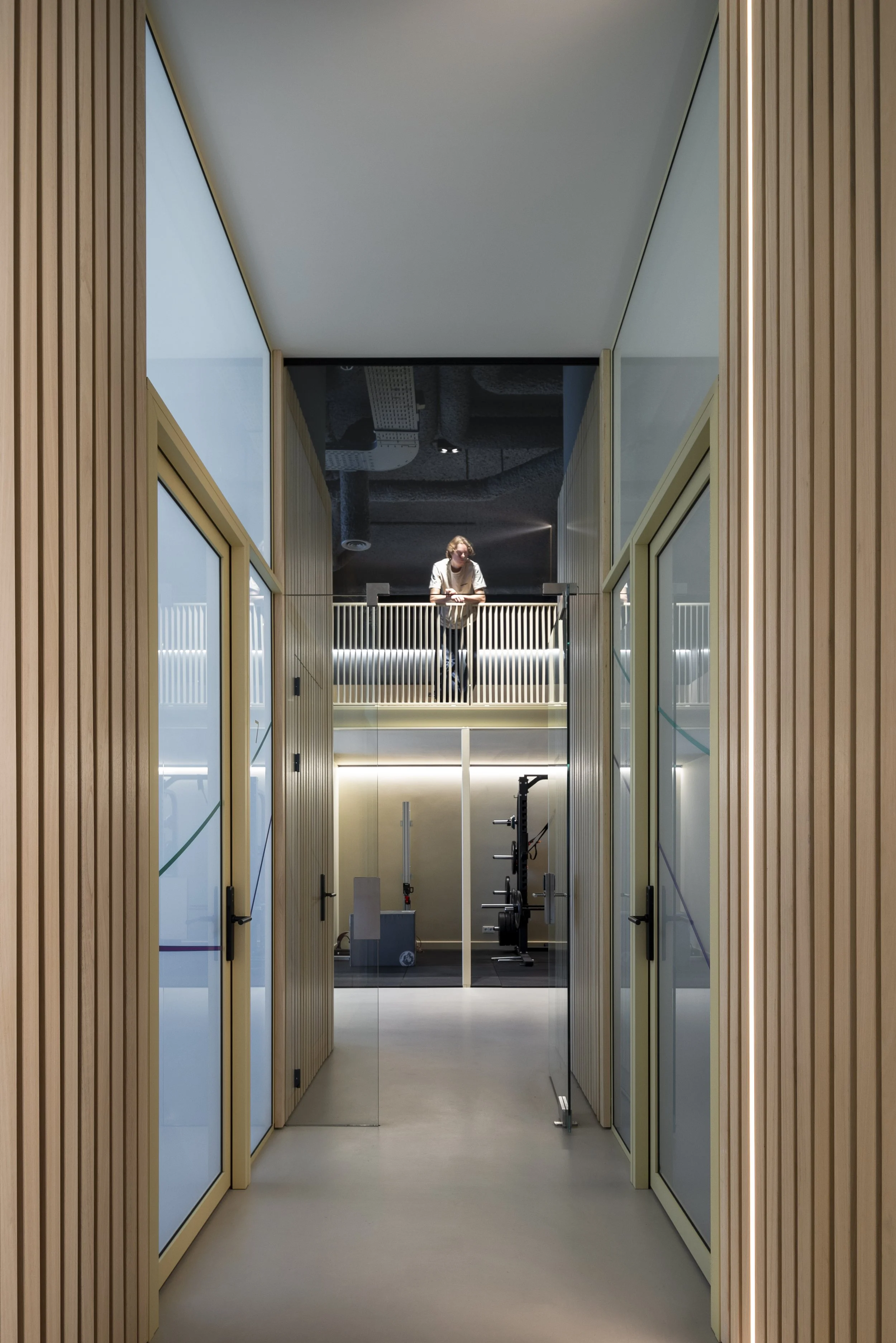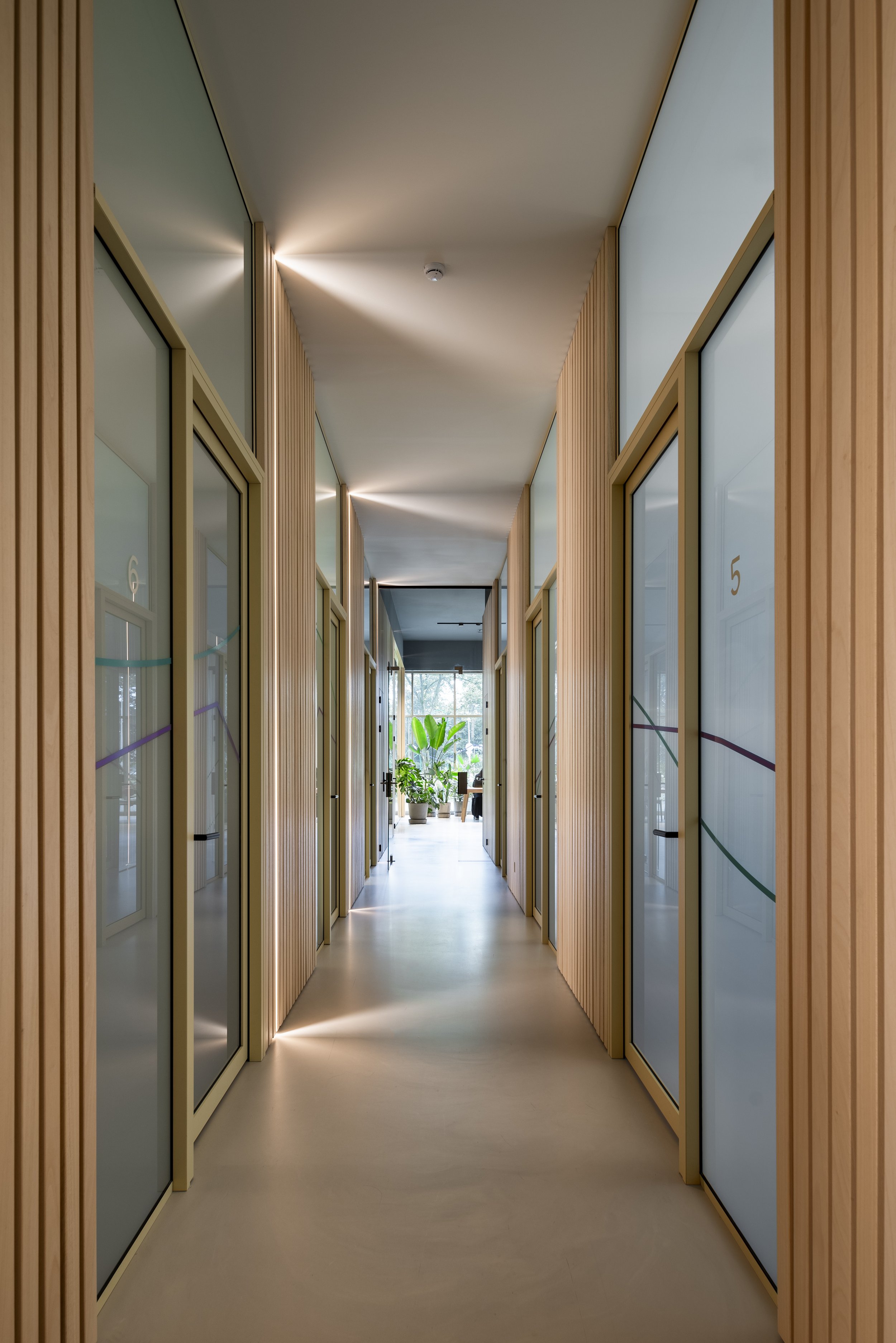 view of the corridor between the reception in the front and the exercise space in the back, frosted glass separating it from the treatment rooms on both sides
