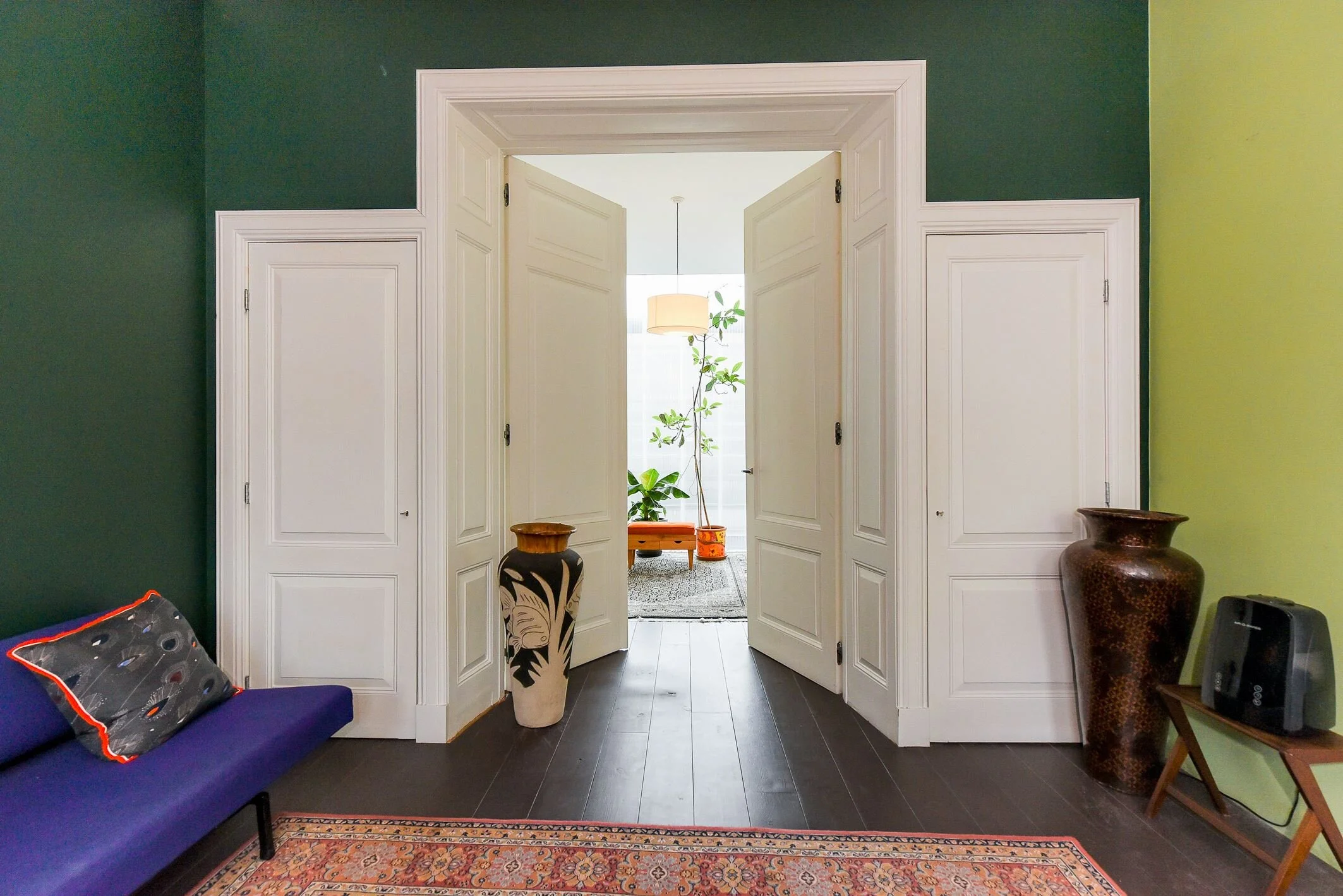 This classic Dutch row house was in poor condition, and required a thorough reinforcement of the foundation and load-bearing structure to make it livable. In spite of its structural issues, the brick building had great potential, as well as strong aesthetic and functional qualities with glass-in-lead detailing, and classic 'en-suite' room separations.