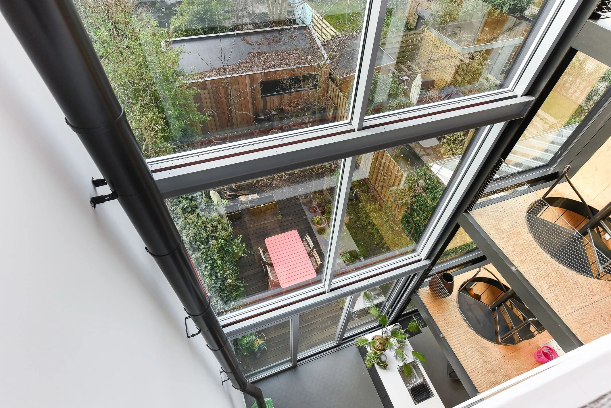 These are connected to the existing floor levels, but the interplay of voids, split-levels, and a full glass façade, crafts a spectacular drama between interior and exterior on the one hand, and between the existing and new floors levels on the other. The new build in the back of the house is a three-dimensional, L-shaped element of five stories, accessed by an elegant steel staircase, which introduces a new dynamic between the different parts of the house. It also facilitates a separation of functions (owners and guests, for example). Vertically, the L-shaped element ends in a roof-terrace, with a jacuzzi and outer kitchen lying far away and above the balconies of the lower floors.