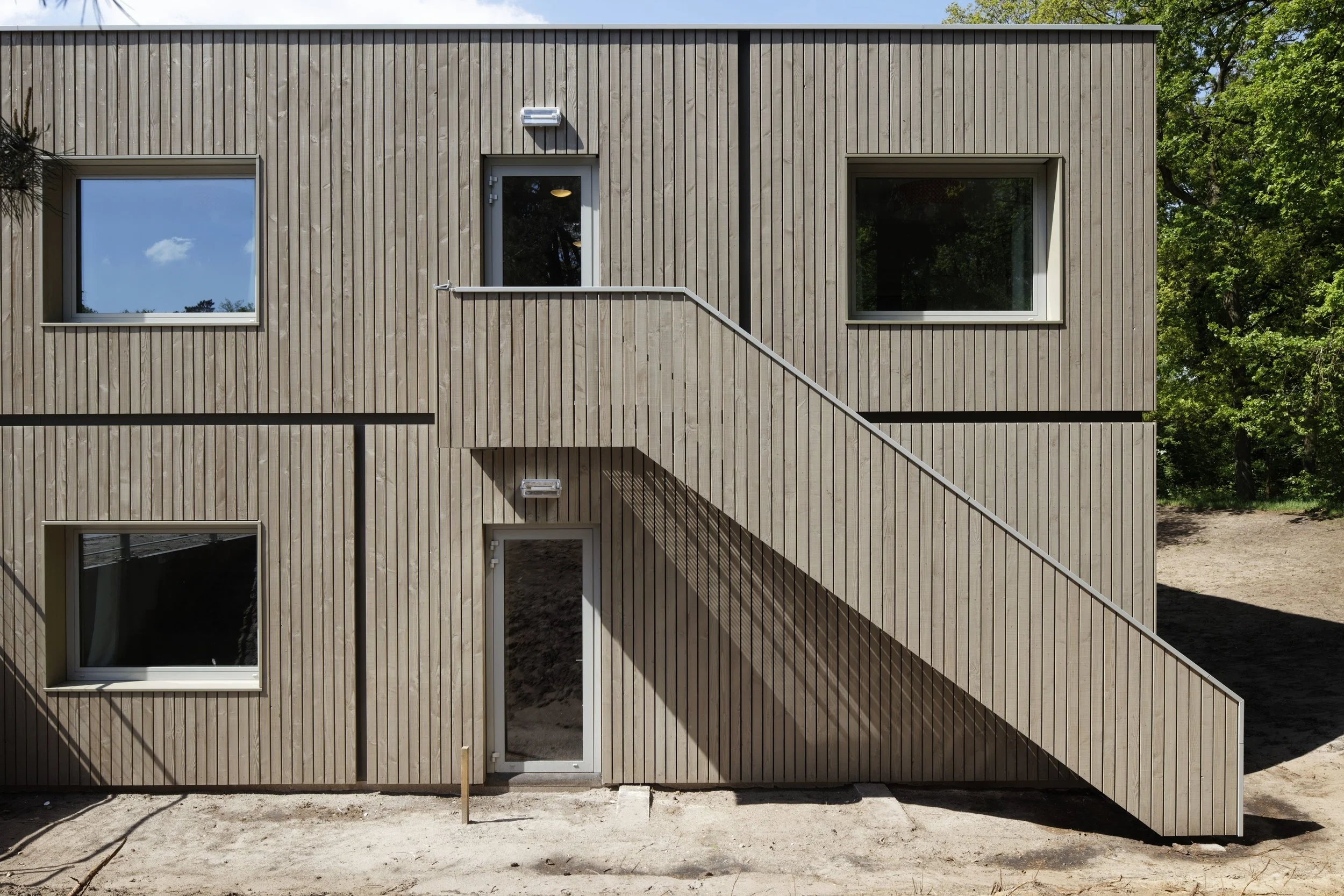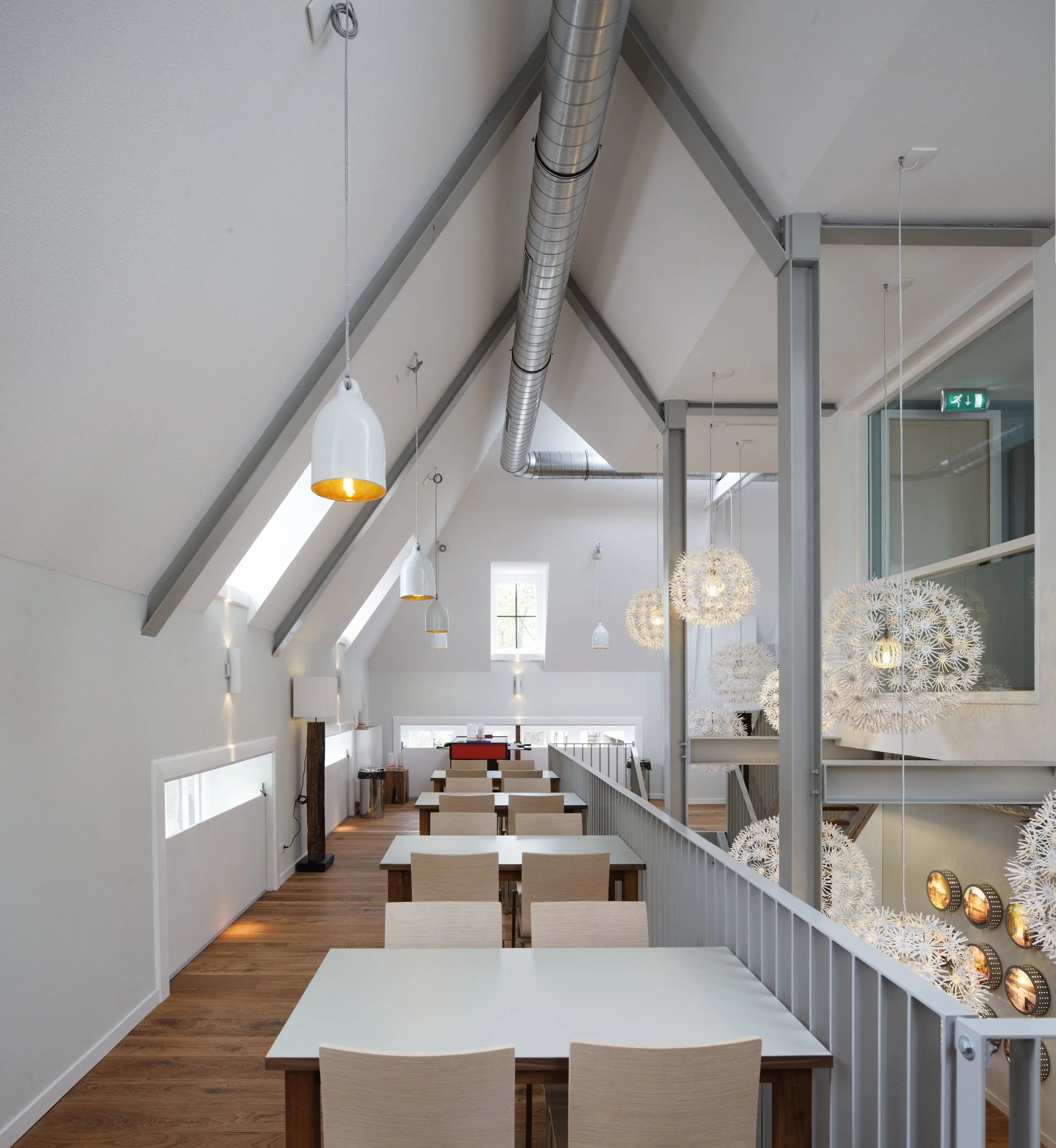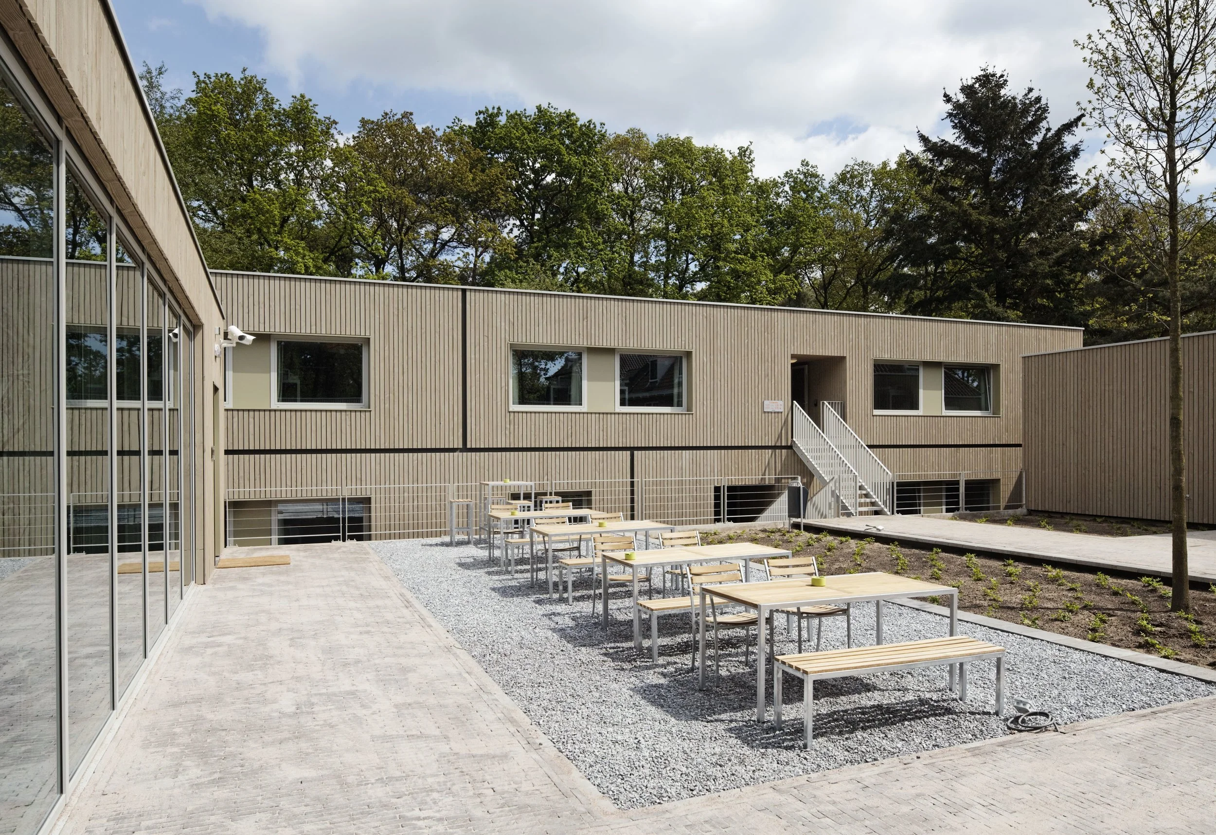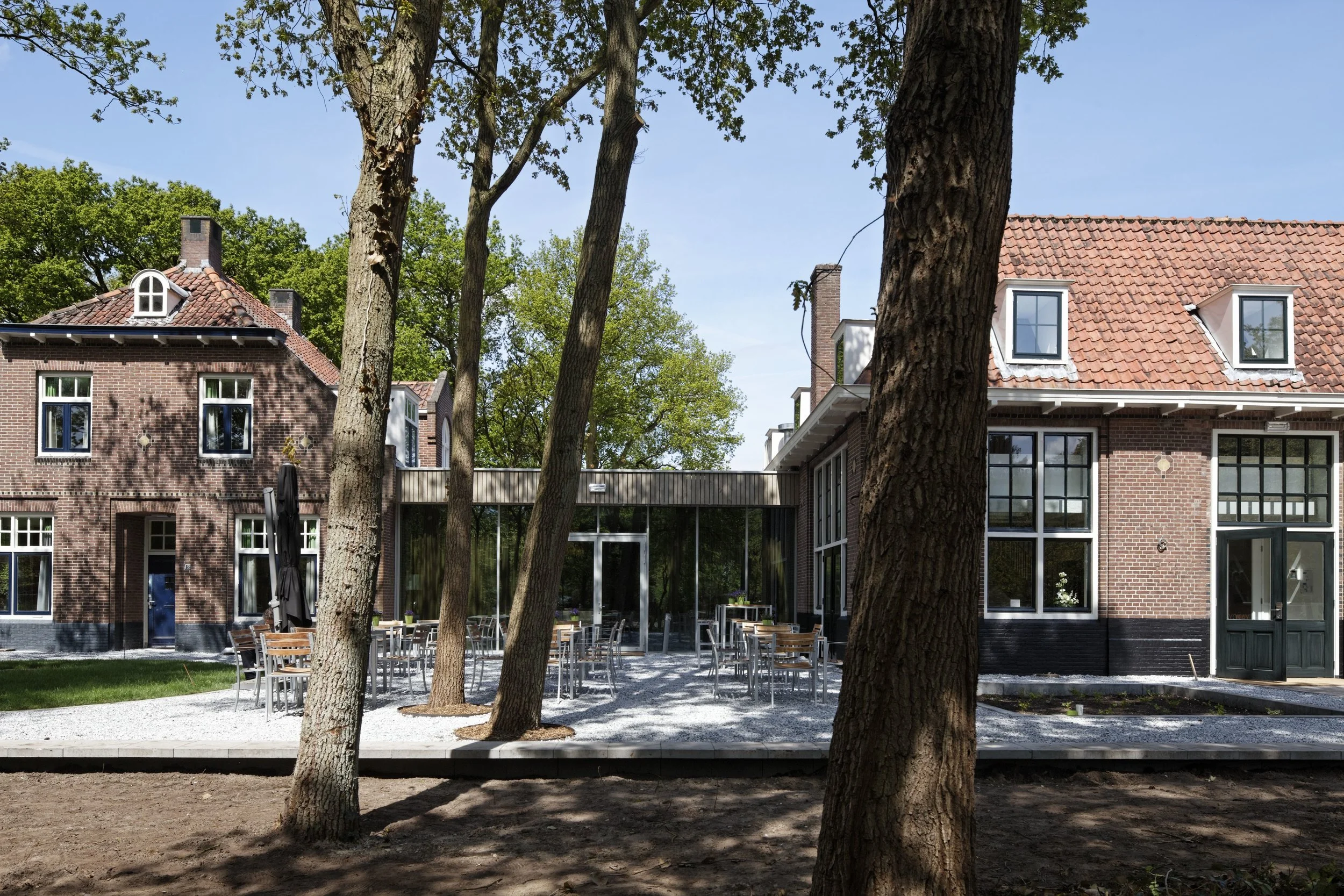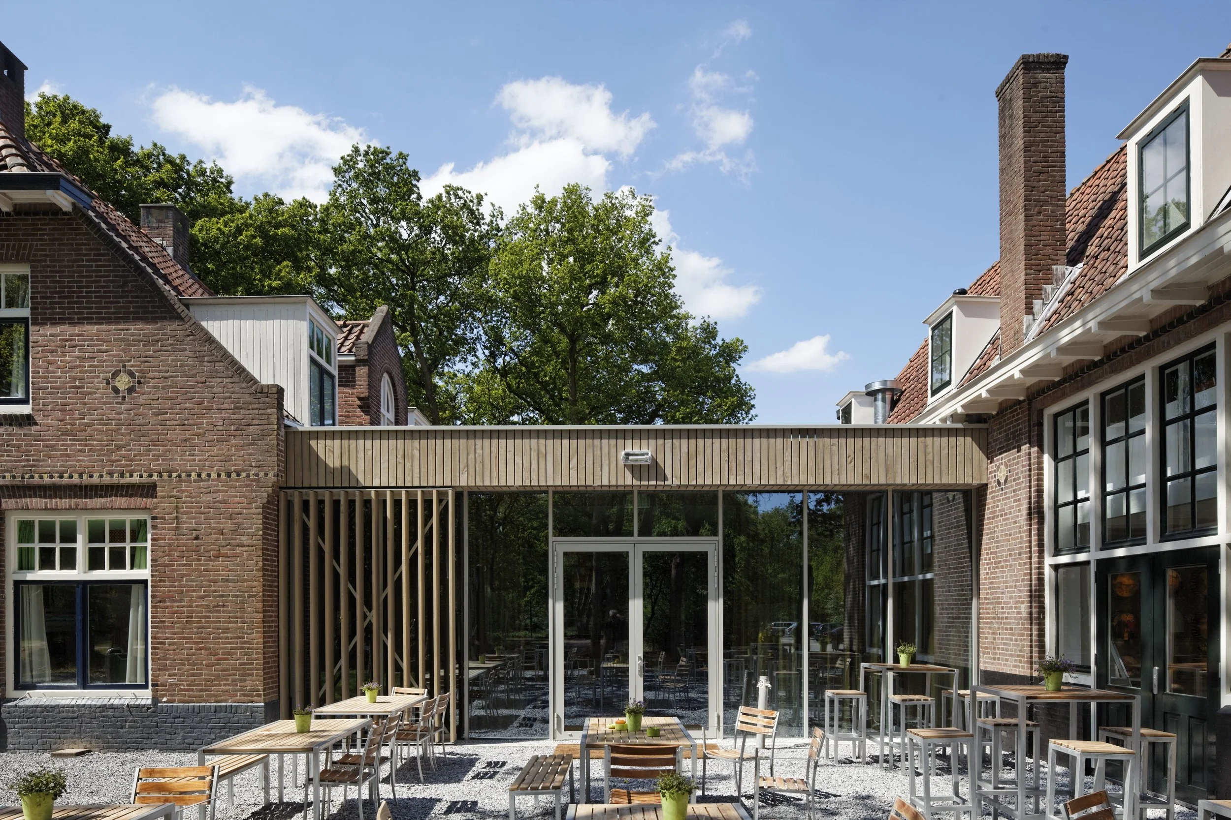 Set in the tranquil woodlands of Soest in the Dutch province of Utrecht, this hostel and hospitality complex was formerly comprised of ad hoc additions which lacked a clear visual order. To draw out the inherent aesthetic qualities of the historic buildings and establish a clear cohesion between the functions of the complex, P·A's strategy included both demolition of underfunctioning buildings, and the subtle introduction of a new form.
