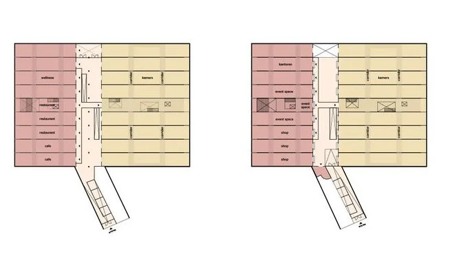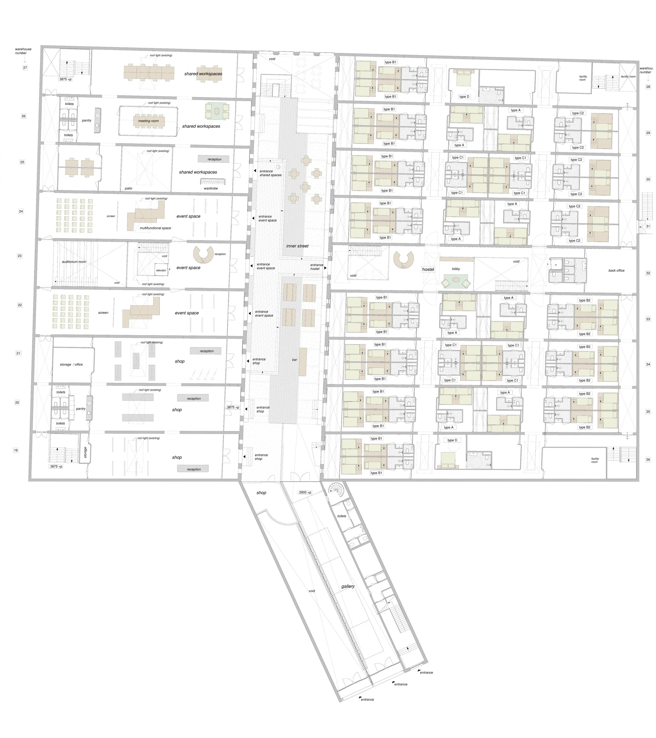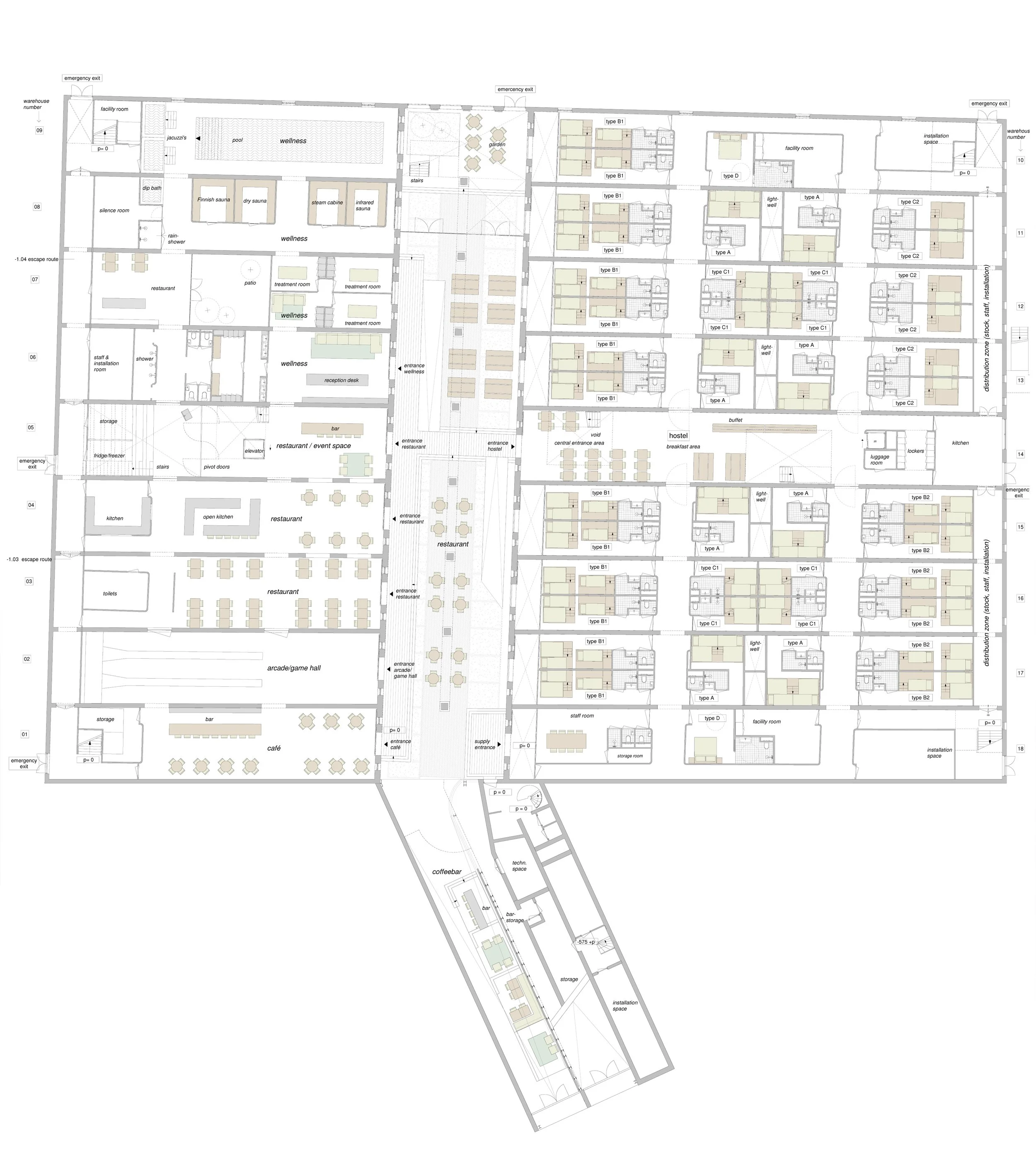 schematic diagrams showing the distinct division of the hostel and public functions, connected through a central axis with upper and lower indoor streets. A total of 18 double-layered warehouses can be distinguished, together grossing an impressive 8.200 square meters
